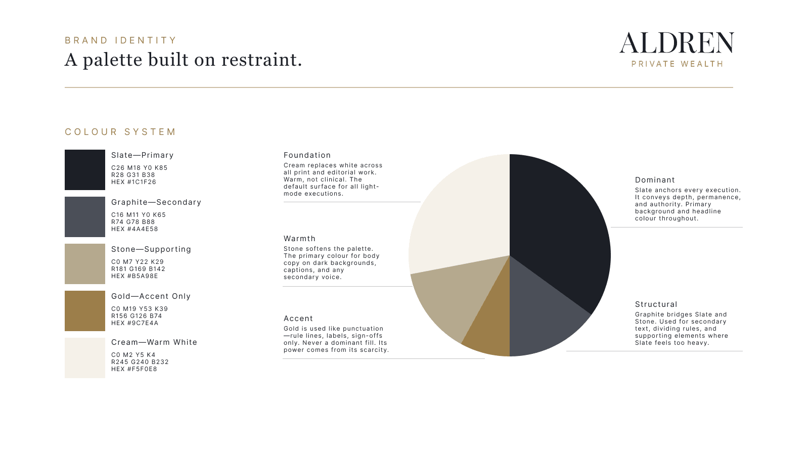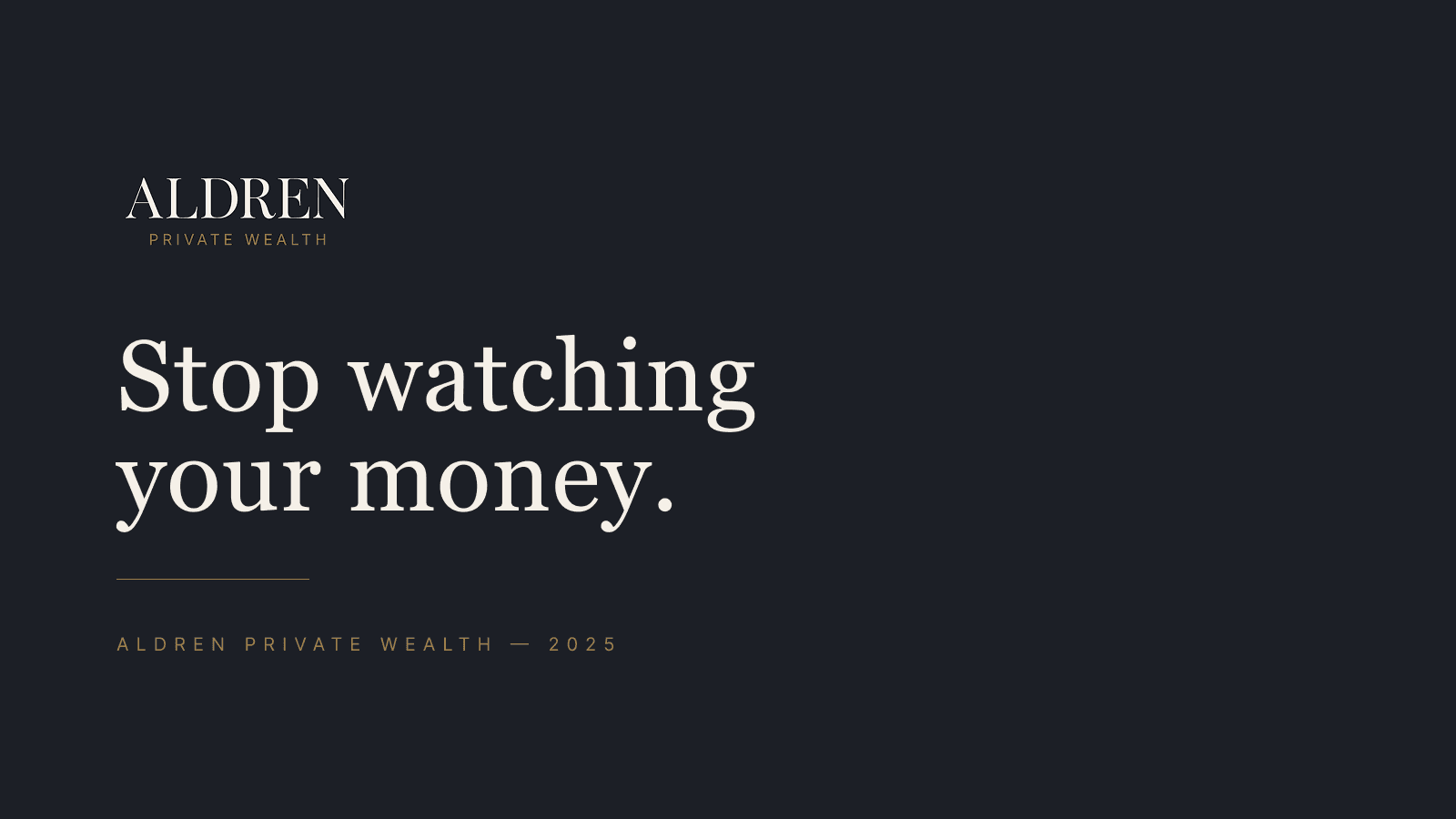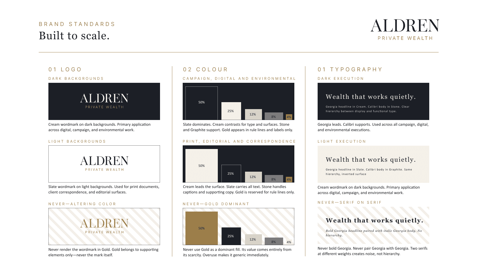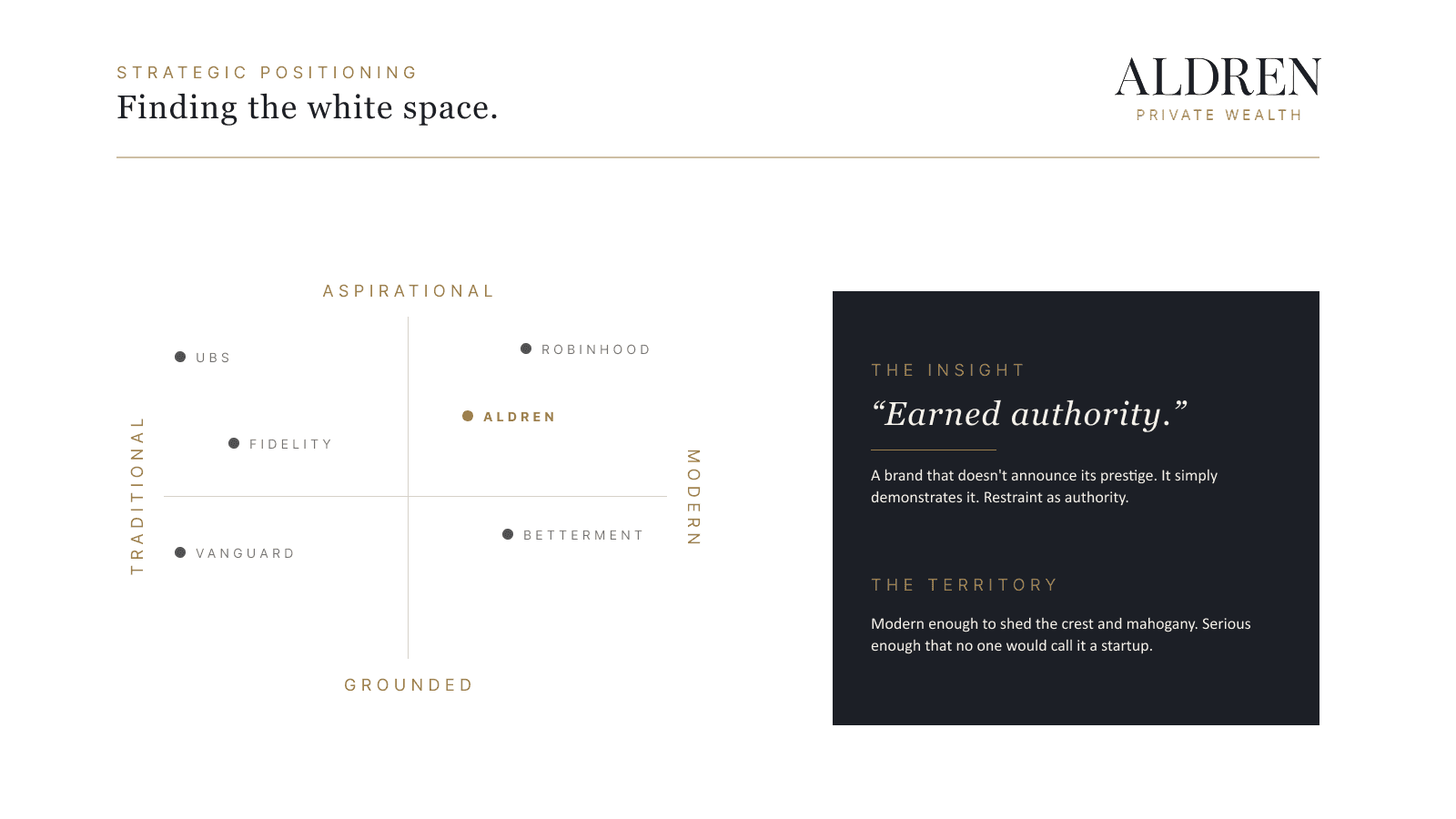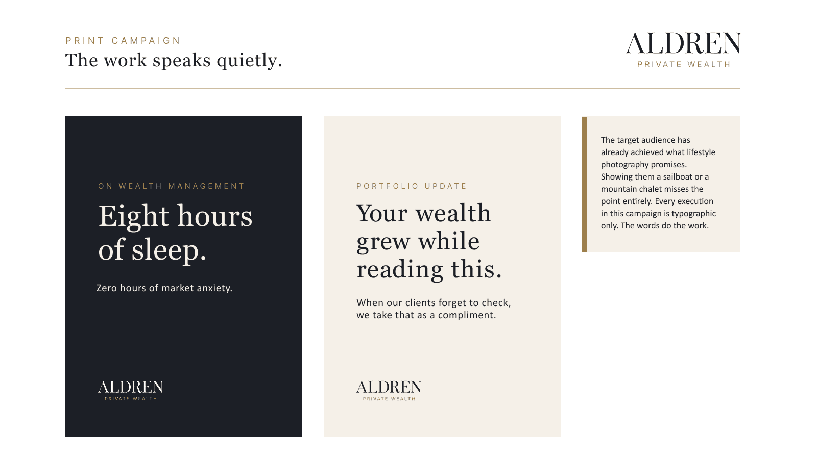 Conceived and led the full creative development of Aldren Private Wealth, a brand built for the white space between legacy wealth management and fintech disruption. The project spans competitive positioning, visual identity, brand standards documentation, and an integrated campaign across print, out-of-home, and digital. Every decision, from palette ratios to campaign line, was made to serve a single strategic idea: earned authority.